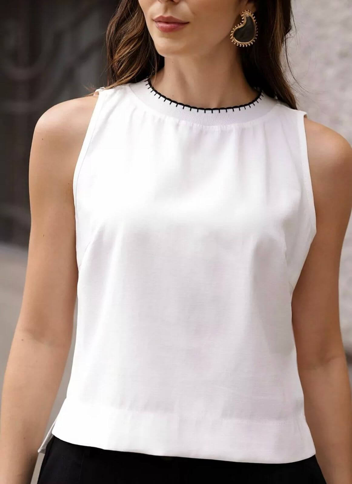 Blusa sem mangas com modelagem reta e caimento leve, trazendo um ar elegante e versátil. O destaque fica para a gola arredondada com acabamento contrastante e detalhe em relevo, que valoriza a peça de forma delicada. Ideal para compor looks tanto mais casuais quanto sofisticados.