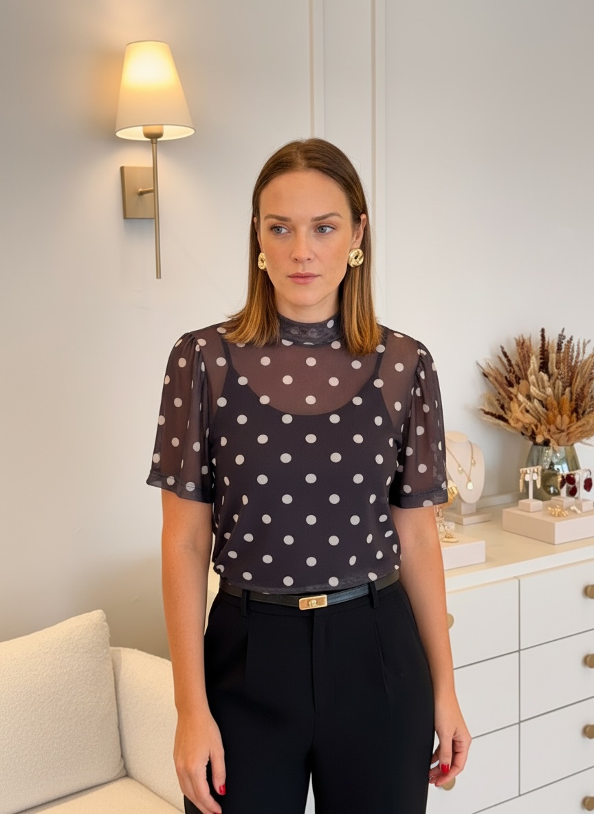 Essa blusa é feita em tule leve e transparente, com estampa de poá branco (bolinhas médias bem distribuídas). Ela tem modelagem soltinha, com caimento fluido, e comprimento tradicional.