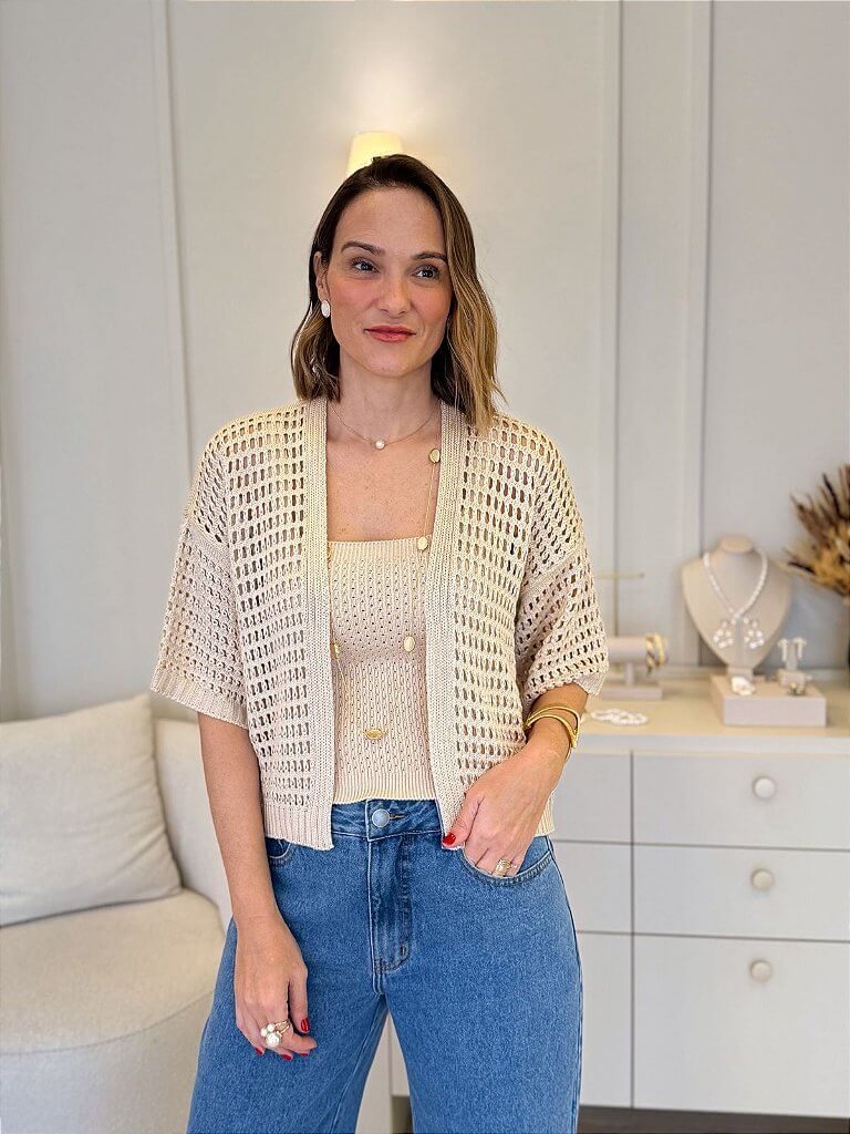 Conjunto charmoso composto por um kimono de crochê vazado e uma regata canelada. O kimono tem modelagem ampla e leve, com mangas curtas e acabamento canelado na barra. Feito em ponto aberto tipo telinha, oferece um visual moderno e arejado, ideal para dias quentes ou para sobreposições estilosas. A peça vem acompanhada de uma regata em malha canelada no mesmo tom, garantindo conforto e cobertura.