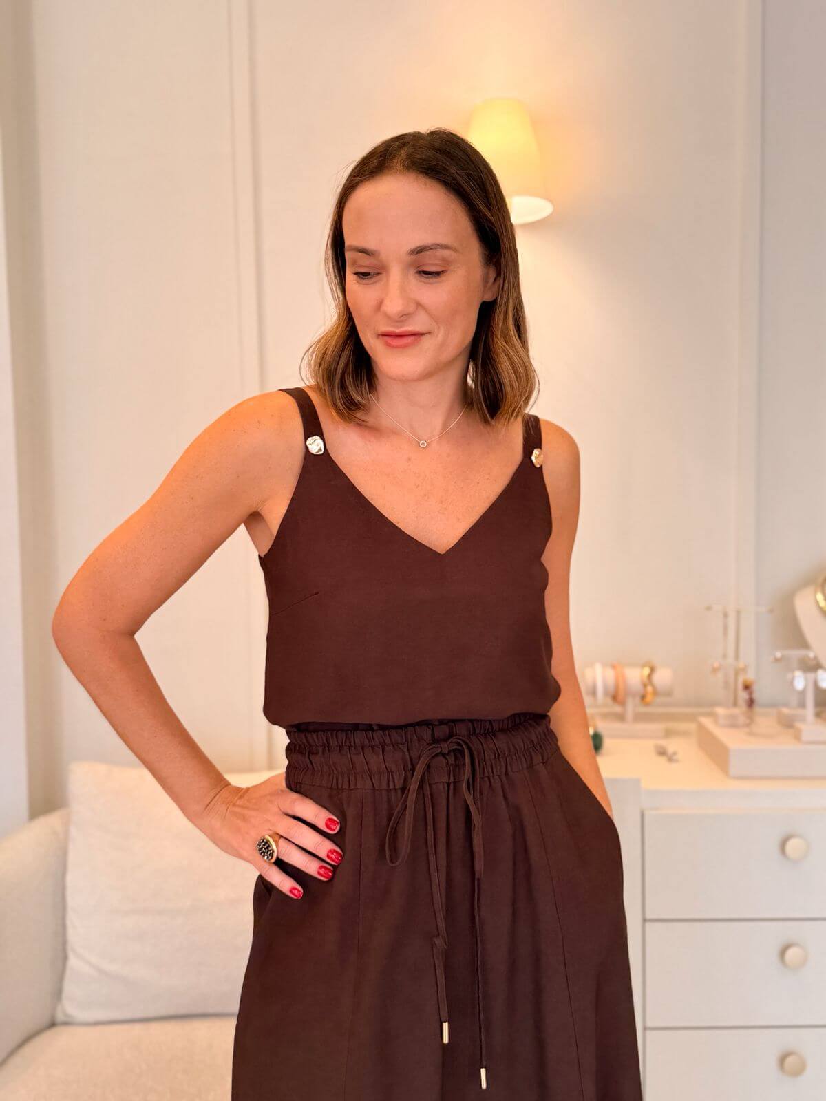 A regata tem modelagem mais reta e decote em “V” suave na parte da frente, criando um visual limpo e delicado. As alças são largas e finalizadas com um botão decorativo dourado, que acrescenta um toque mais sofisticado. O tecido tem caimento leve e uniforme, deixando a peça com aparência bem alinhada e confortável.