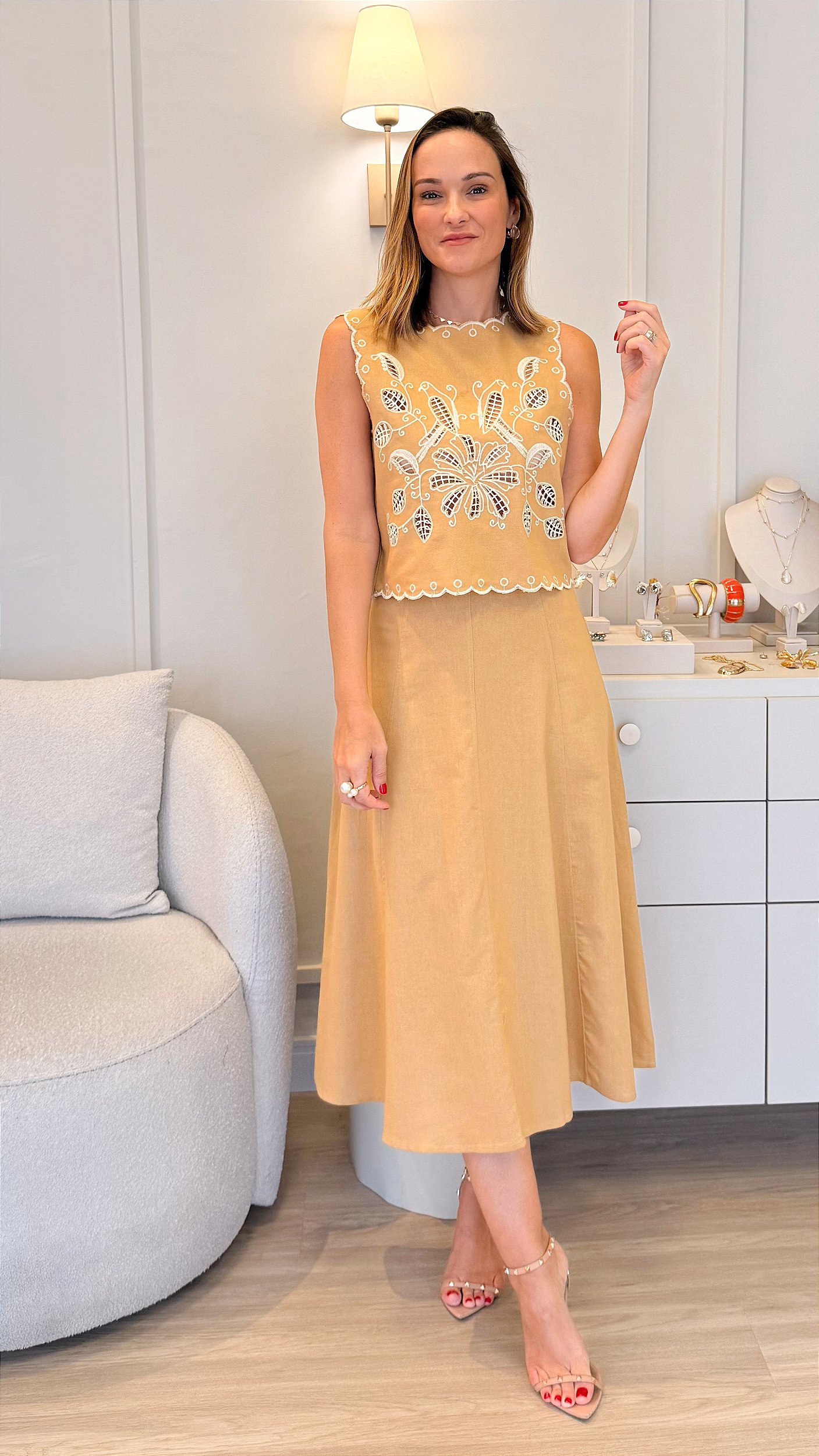 Saia midi com cintura marcada, tecido leve e boa fluidez, criando um caimento suave e movimento natural ao andar. O corte é amplo, no estilo evasê, deixando a silhueta alongada e elegante.