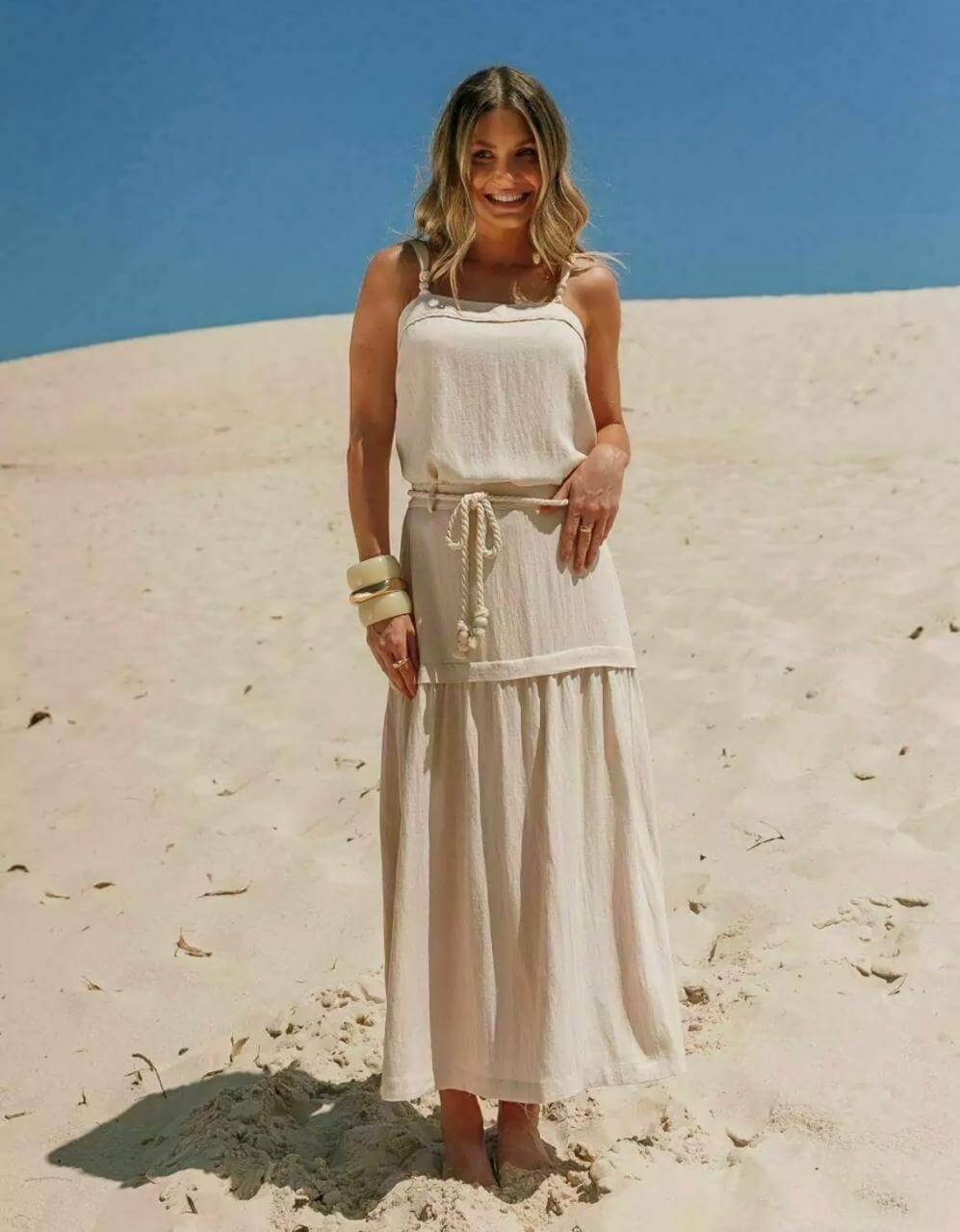 A saia é longa, com caimento leve e movimento suave. Ela tem cintura ajustável por um cordão trançado com ponteiras decorativas, deixando o visual mais delicado. A peça conta com uma pala mais reta na parte superior e um recorte amplo na parte de baixo, criando um efeito levemente fluido e elegante. É uma saia que transmite leveza e combina muito com propostas casuais e frescas.