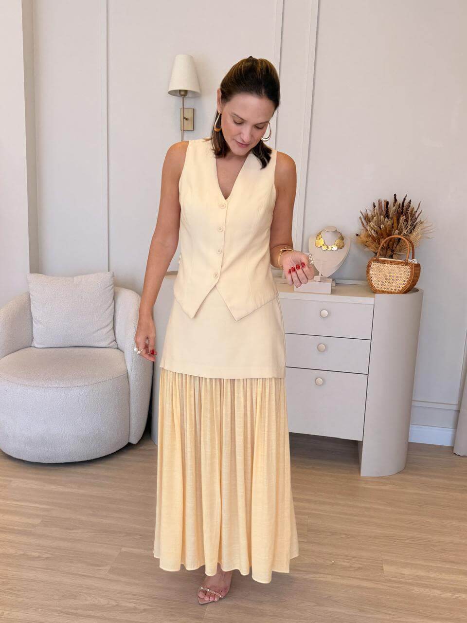 A saia é longa na cor manteiga, com a parte superior lisa e estruturada até o quadril. Abaixo dessa faixa, o tecido fica franzido, criando um caimento amplo e fluido até a barra. O resultado é um visual leve, delicado e elegante