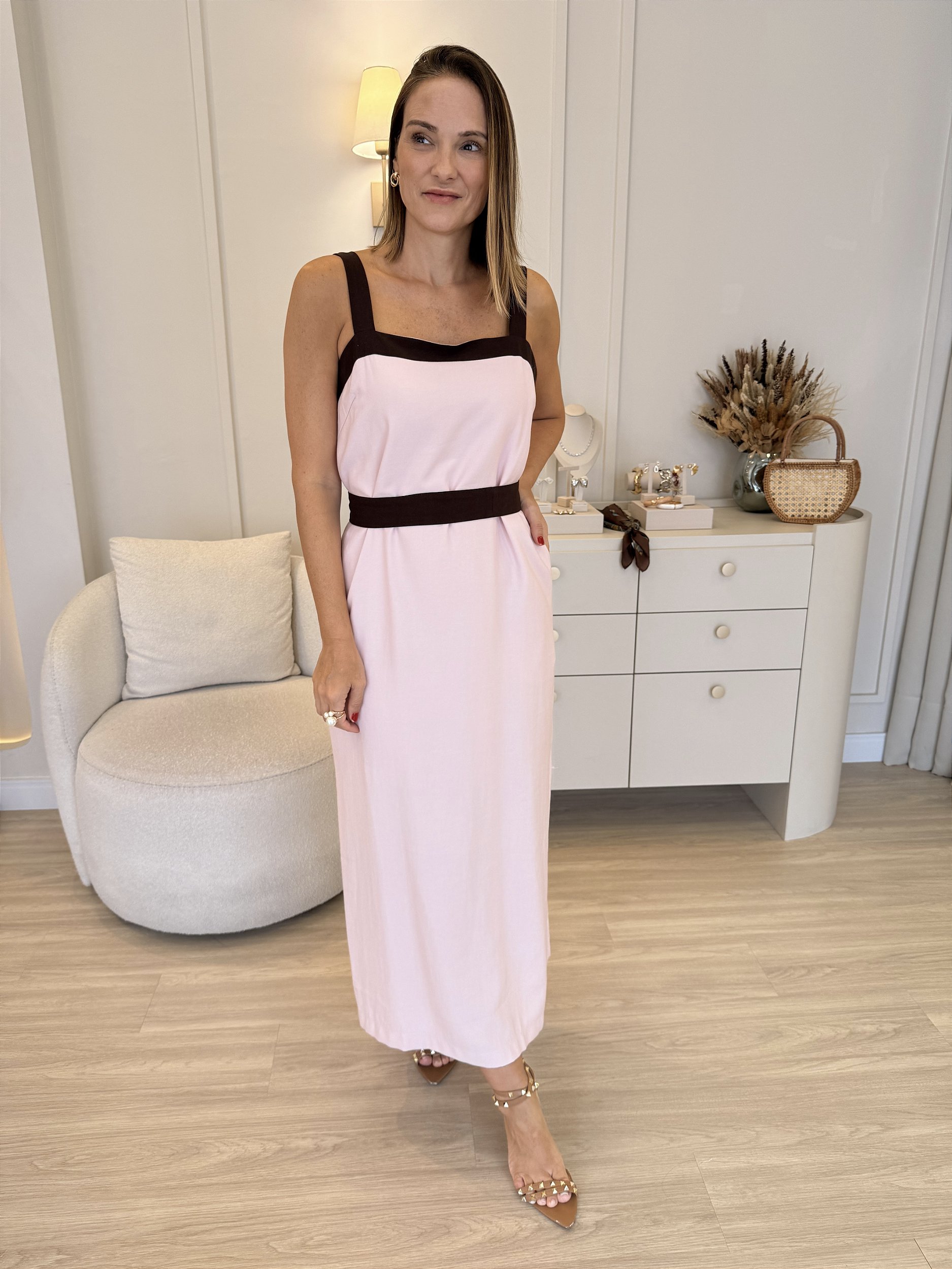 Vestido de modelagem leve e elegante, com caimento fluido que valoriza o corpo. Possui alças mais largas e decote reto, trazendo um visual moderno e sofisticado. O destaque fica por conta da faixa do próprio tecido, que acompanha a peça e pode ser usada para marcar a cintura, permitindo ajustar o vestido conforme o seu estilo. Um modelo versátil, perfeito para composições mais delicadas ou produções mais arrumadas, dependendo dos acessórios.
